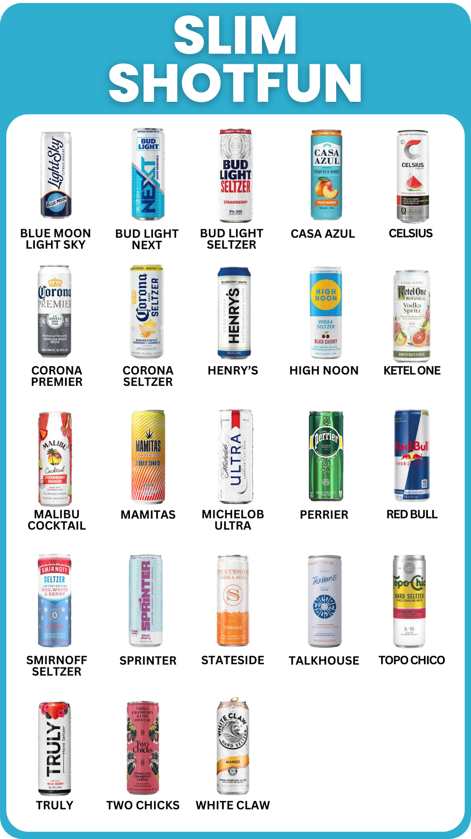 Cans that fit: High Noon, Truly, Michelob Ultra, Whiteclaw, Redbull, Bud Light NEXT, Coors Slim cans, and many more!